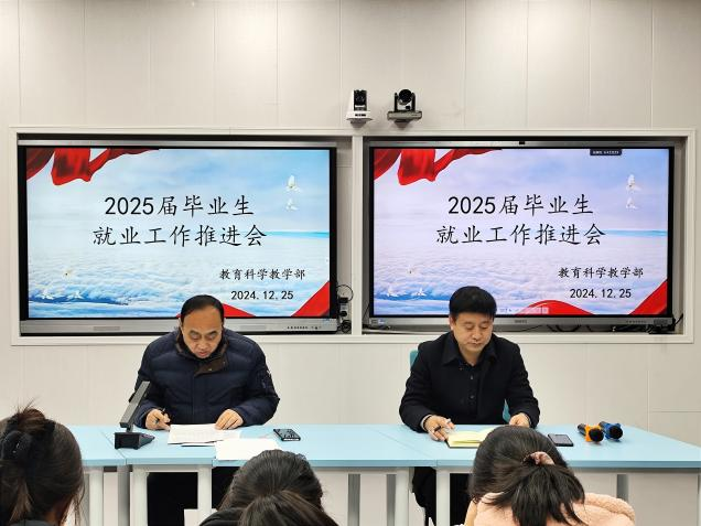 为帮助2025届毕业生明确就业方向,树立正确就业观念,提升就业竞争力,教育科学教学部于2024年12月25日在澄心楼506召开了“2025届毕业生就业工作推进会”。高建超书记、宋会华副书记出席会议,21级全体同学参加。