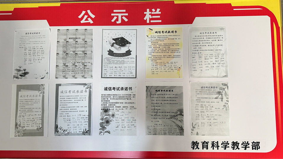 班会中,班长强调诚信考试的重要性,并向全体同学发出诚信倡议,共同维护一个公正、公平的考试环境。诚信考试是确保教育质量、维护学术公正的关键。它体现了个人对知识的尊重和对学术规范的遵守。通过诚信考试,我们能够真实地反映学生的学习成果,为教师提供准确的教学反馈,为同学们的未来学习和职业发展打下坚实的基础。各班班长制作诚信考试倡议书,同学们认真阅读了期末考试须知,并清楚了解违反考风考纪的严重后果。同学们郑重承诺自觉服从考试组织管理部门的统一安排,接受监考人员的管理、监督和检查,自觉遵守考试纪律、考场规则,诚信考试,不作弊。同学们在诚信考试倡议书上签字,并由班长将诚信考试倡议书贴于教育科学教学部公示栏进行公示。