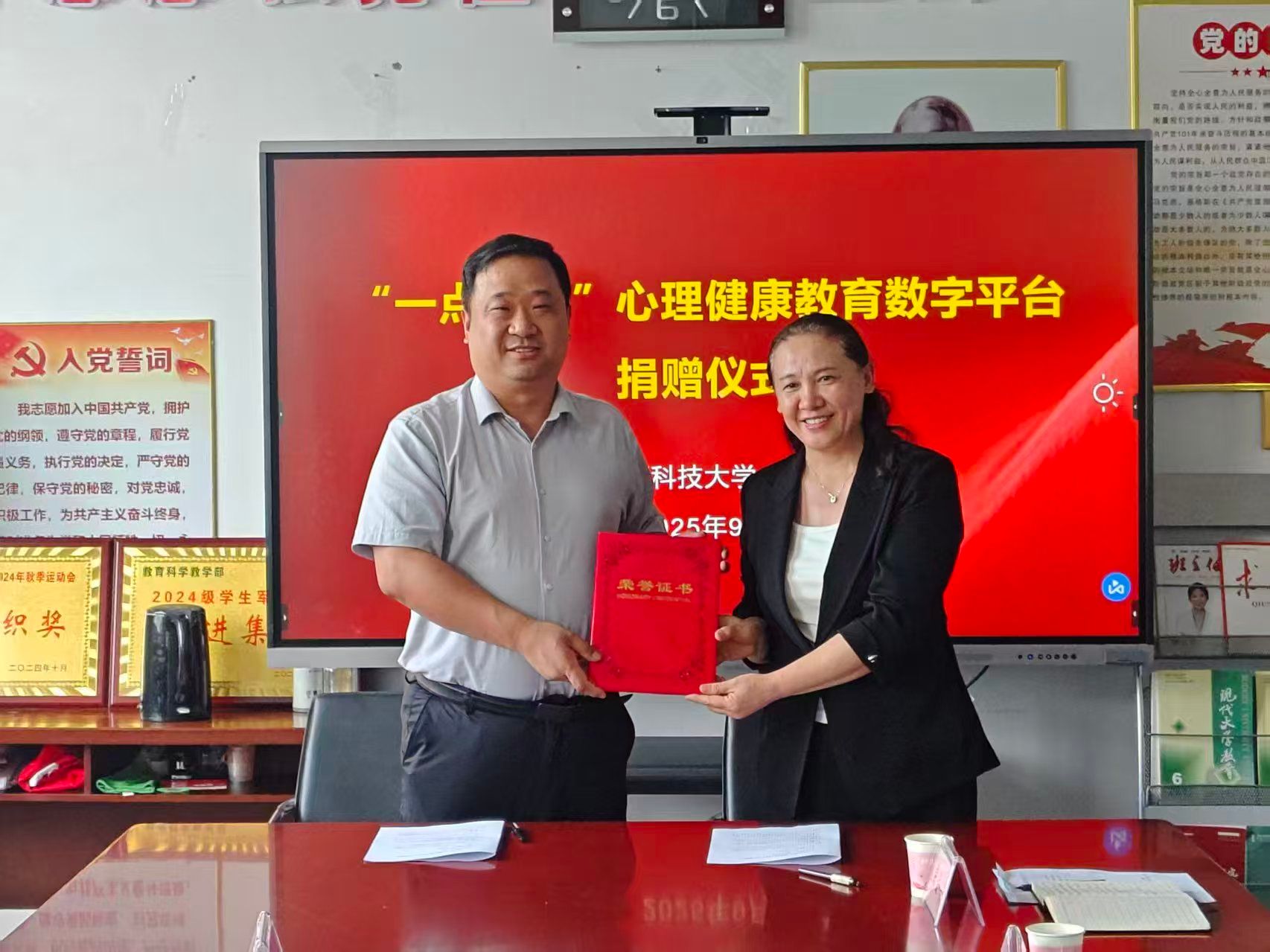 秋阳杲杲,情深意浓。9月20日下午,一场温暖而特别的捐赠仪式在邢台学院澄心楼403会议室举行。我校历史学专业2005级优秀校友、陕西科技大学科技处副处长徐卫涛先生,代表原校园文明督察队全体队员,向母校捐赠了价值不菲的“一点心通”心理健康教育数字平台。鉴于该平台的专业属性,我校教育科学教学部作为具体接收单位。仪式由教育科学教学部党总支副书记宋会华主持。